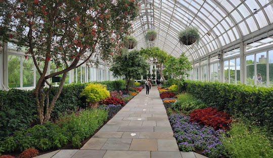 가을엔 단풍이 황금빛으로 물들고, 겨울엔 하늘하우스에서 열리는 '홀리데이 트레인 쇼(Holiday Train Show)'가 가장 큰 볼거리입니다. 실제로 미니어처 뉴욕시를 기차가 달리는 그 전시는 어른에게도 동심을 불러일으키는 신기한 장면이에요. 제가 가장 좋아하는 공간은 에니드 A. 하우프트 콘서버토리(Enid A. Haupt Conservatory)예요. 유리 온실 건물인데, 안으로 들어서면 세계 각지의 열대 식물, 사막 선인장, 희귀 난초들이 살아 있어요.