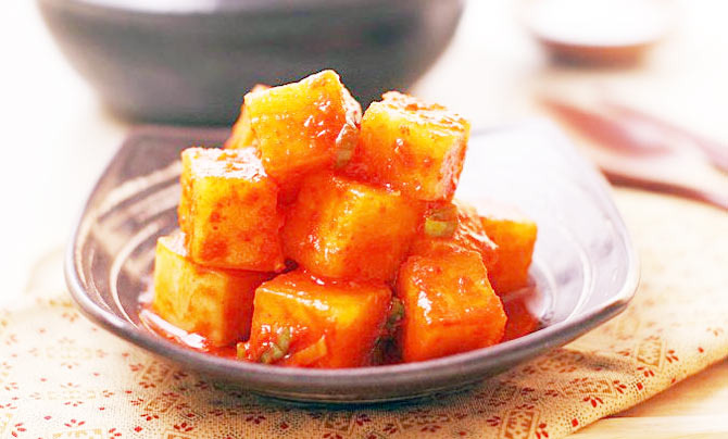 When you pick up a piece with chopsticks, the crunch sounds delightful, and the flavors of pear juice and salted shrimp blend together, leaving a subtle sweetness. This is the secret of restaurant-style radish kimchi.