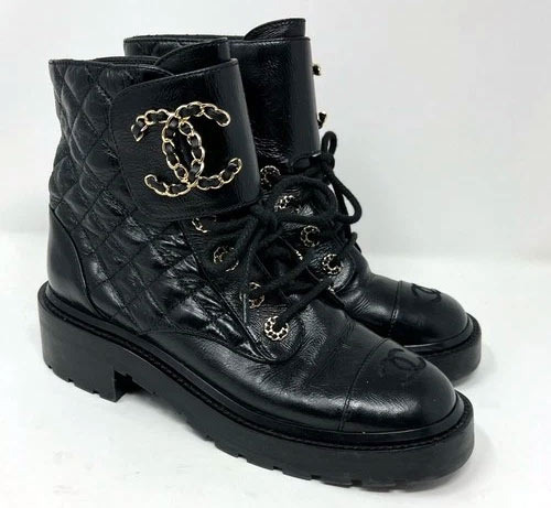 The price of Chanel's combat boots, like the Shiny Lambskin Quilted Lace Up Combat Boots 37 Black, exceeds $1,800.