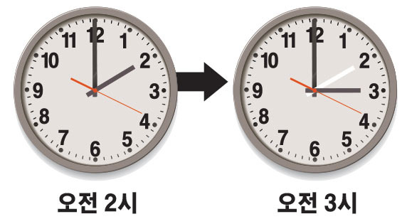 8일 새벽 2시가 되는 순간 시계를 한 시간 앞으로 돌립니다. 새벽 2시는 바로 3시가 됩니다.