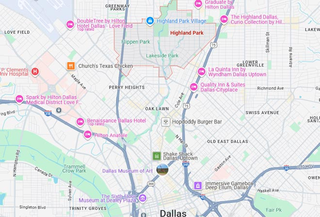 하이랜드 파크(Highland Park)는 달라스 중심부에서 북쪽으로 약 4마일 떨어진 곳에 위치한 고급 주거 지역으로, 텍사스에서도 손꼽히는 부촌입니다. 달라스 인근지역이라서 차로 10분이면 달라스 다운타운에 도착할 수 있을 정도입니다.