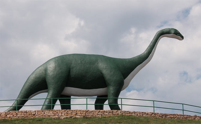 The seven large dinosaur sculptures made of cement were all handcrafted, with popular dinosaurs like Brontosaurus, Triceratops, Stegosaurus, and Tyrannosaurus lined up at the top of the hill. While they may seem simple in form today, they hold significant historical value as they represent the imagined dinosaurs of the time when scientific knowledge was lacking in the 1930s. Therefore, this park is regarded not just as a tourist spot but as an 'early form of an American dinosaur museum.'