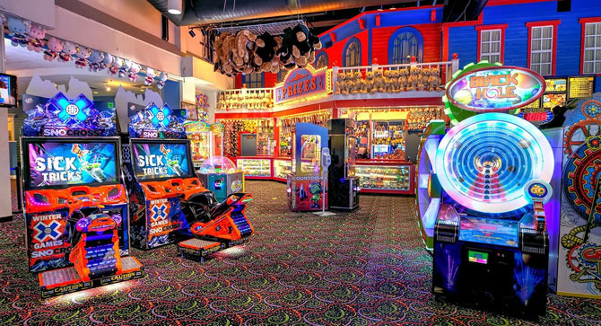 리노의 또 다른 가족형 명소로는 Grand Sierra Resort and Casino(GSR)를 빼놓을 수 없어요. 이곳은 리노 최대 규모의 리조트 중 하나인데, 아이들을 위한 놀이공간이 도시 전체에서 가장 다양합니다. 우선 Fun Quest Family Arcade라는 대형 오락실이 있는데, 규모가 웬만한 쇼핑몰 게임존 수준이에요. 수십 대의 아케이드 게임기, 레이싱 시뮬레이터, 리듬 게임, 인형 뽑기 기계가 즐비하고, 포인트를 모아 상품으로 교환할 수도 있습니다.