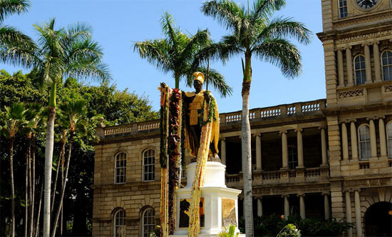 동상은 알리이올라니 할레(Aliiolani Hale) 앞에 서 있는데 바로 그 뒤로 하와이 주 대법원 건물이 있습니다.