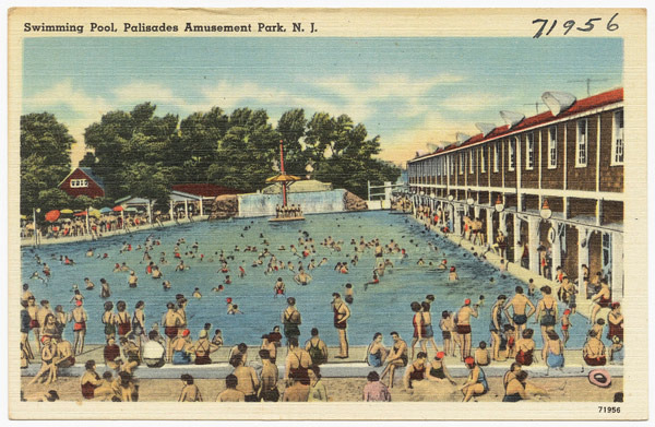 지금처럼 에어컨이 보급되지 않았던 1930년대 여름 더위는 정말 견디기 힘들었어요. 뉴욕과 뉴저지의 노동자 계층, 이민자 가족들은 잠시나마 도시의 열기에서 벗어나기 위해 허드슨 강을 건너 팔리세이즈 파크로 향했습니다. 그곳에는 거대한 원형 수영장이 있었는데 규모가 어마어마했습니다.